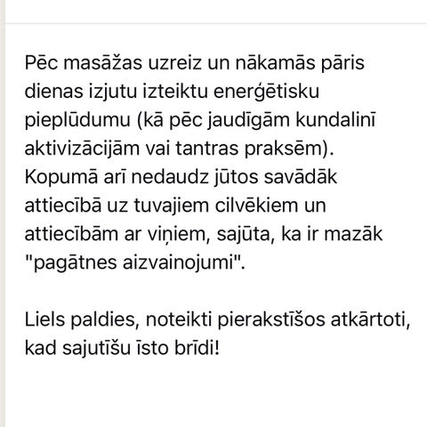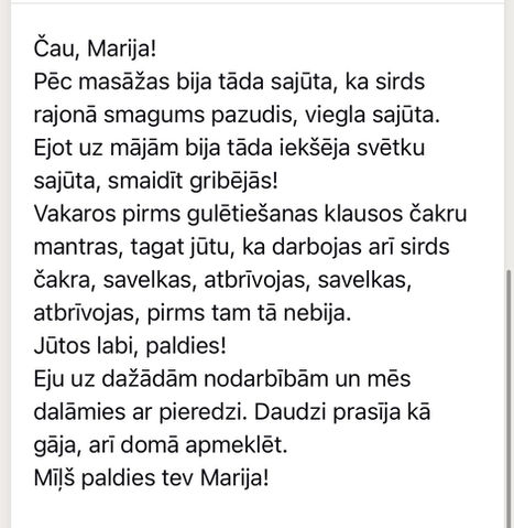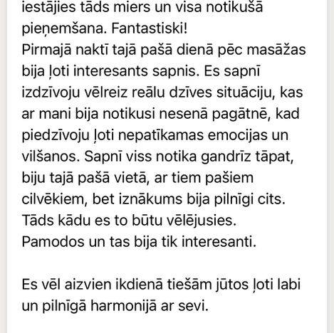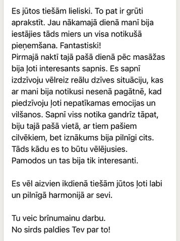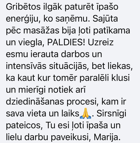 Masāža ir piemērota gan tiem, kuri meklē papildus atbalstu grūtos brīžos un dzīves krustcelēs, kā arī katram, kurš vēlas kļūt apzinātāks, mierpilnāks un laimīgāks.